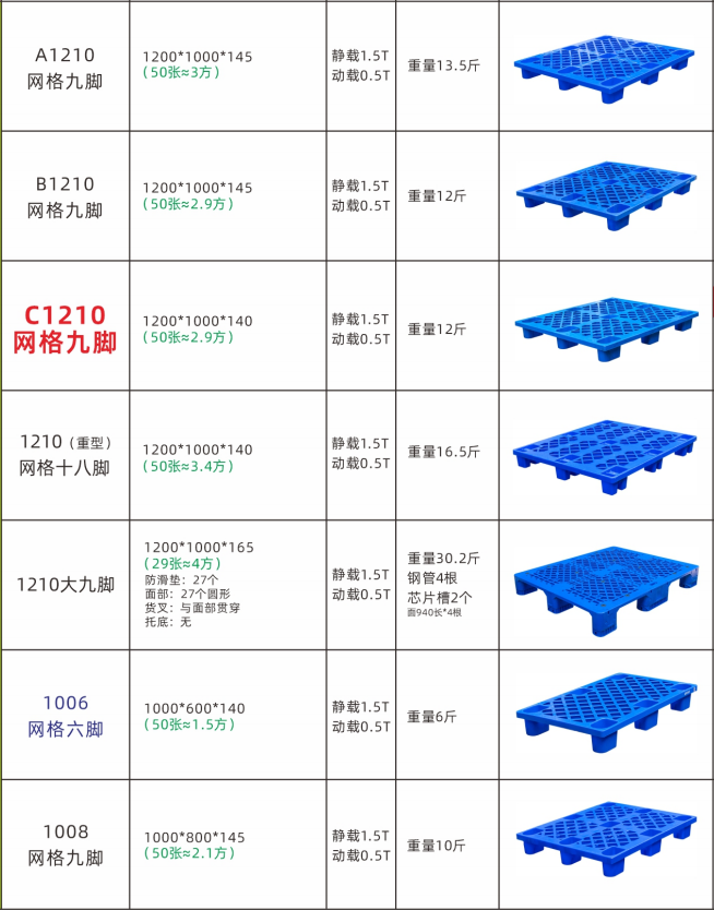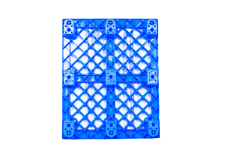九脚塑料托盘,即根据塑料托盘的外形而言的,此类型的塑料托盘底部为九脚型,因而得名九脚塑料托盘。此类一般承载都比较轻,不适合于上货架或者转载大重量的货物,九脚托盘一般都作为仓库轻型货物垫仓板,叉车周转较轻货物使用。此类托盘表面形状有:平面与网格之分。